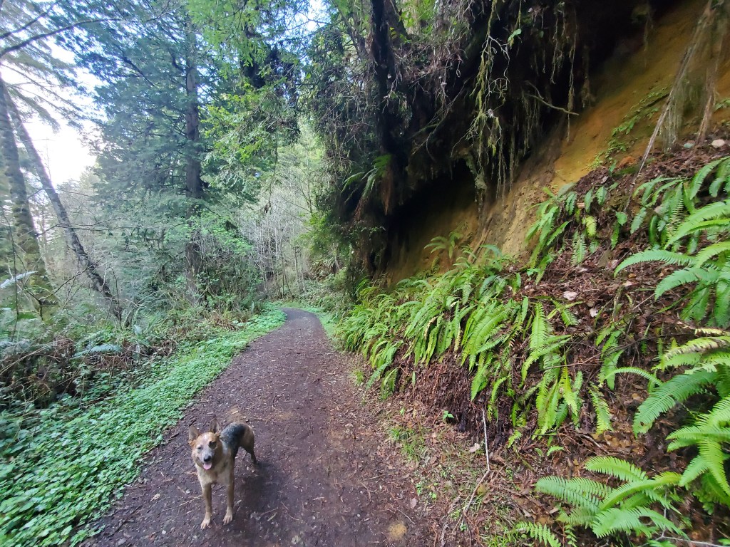 After lunch, we went for our first hike in the redwoods. The outskirts of Arcata are all considered second-growth redwoods. But they are still big and beautiful. The lush and vibrant spectrum of colors we observed on our hike was striking. Dottie was happy as could be. And muddy as ever.