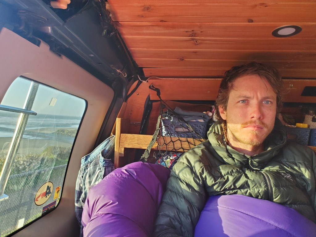 Despite the cooler temperatures, the ocean was calling. I really wanted to jump in so I could wash away the foul mood that had overcome me. At some point after filling up gas, Dottie jumped up in between Whitney and me and spilled coca-cola everywhere. I was immensely frustrated. So in Port Orford, OR we spotted a scenic-looking bay with enticing waves. We parked the van, changed into our bathing suits, and blasted down to the beach. We ran so to not get too cold before hitting the water. On the count of three Whitney and I ran into the ocean, diving headfirst. We came up laughing, smiling, and shivering. Dottie had followed us in also.