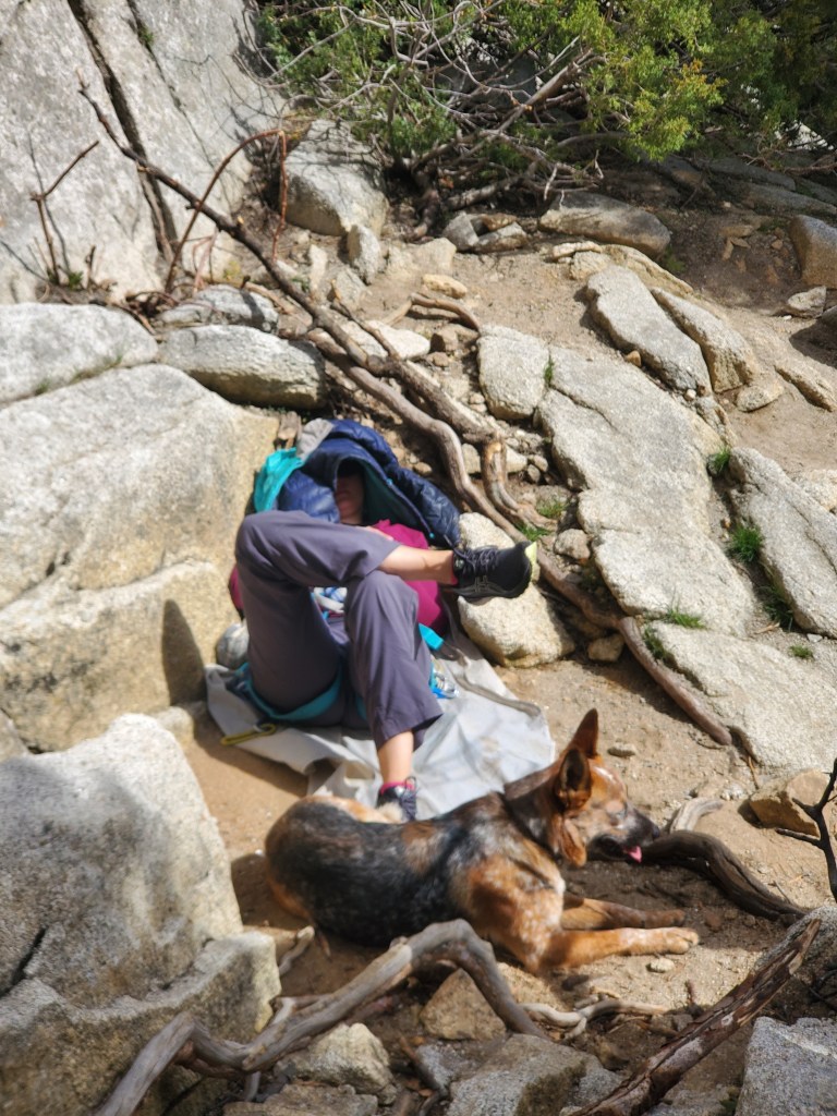 Due to the chillier weather forecast, we enjoyed an almost solitary morning of climbing. There were just a handful of parties willing to brave the temperatures. We were only a stone’s throw away from the van. So at lunch, I jogged back to the van to grab some extra lunch luxuries to boost our otherwise slimmed-down picnic lunch. In the sun, the rock was warm. But snow still sat in the shadier and north-facing nooks and crannies of the rocks.