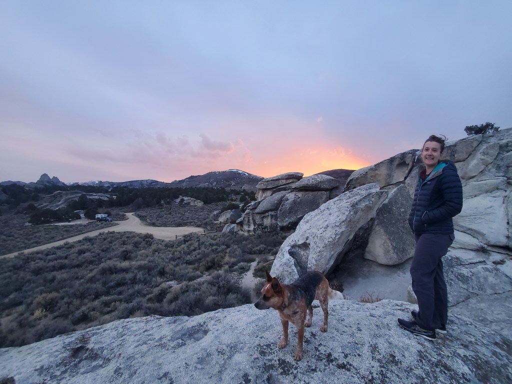On our third night in the City of Rocks, we decided to stay in the campground instead of on the outskirts of the Preserve. It wasn’t free, but it was very worth it. The campsites were well crafted. There were picnic tables, fire rings, and tent platforms on every site. The sites themselves were tucked in between boulders, on cliffsides with expansive views, and within aspen groves. Whitney and I found a wonderful site and made it just in time to enjoy the sunset.